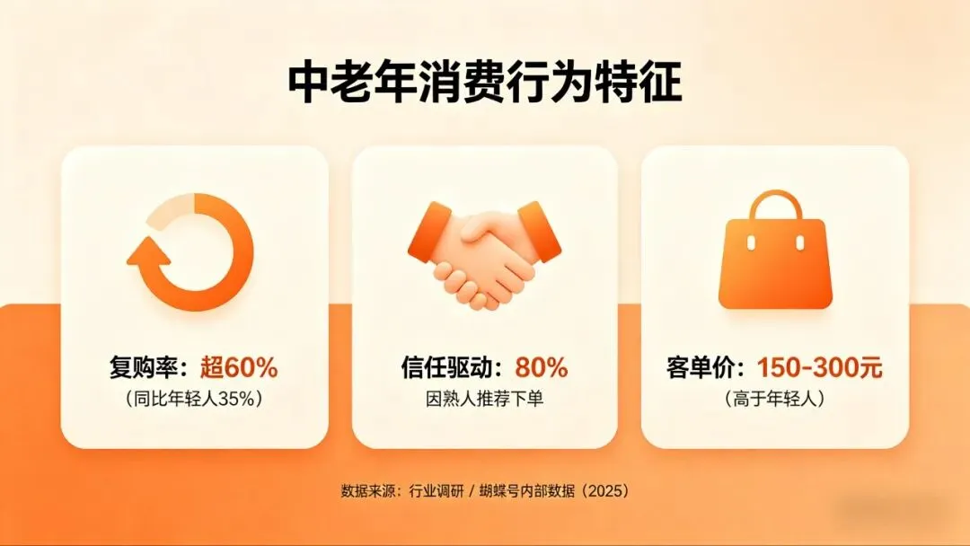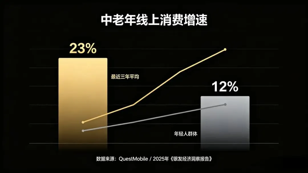 数据显示,中老年群体的线上消费增速连续三年超过年轻人。他们买保健食品、买家居用品、买文娱产品,客单价高、复购率高。