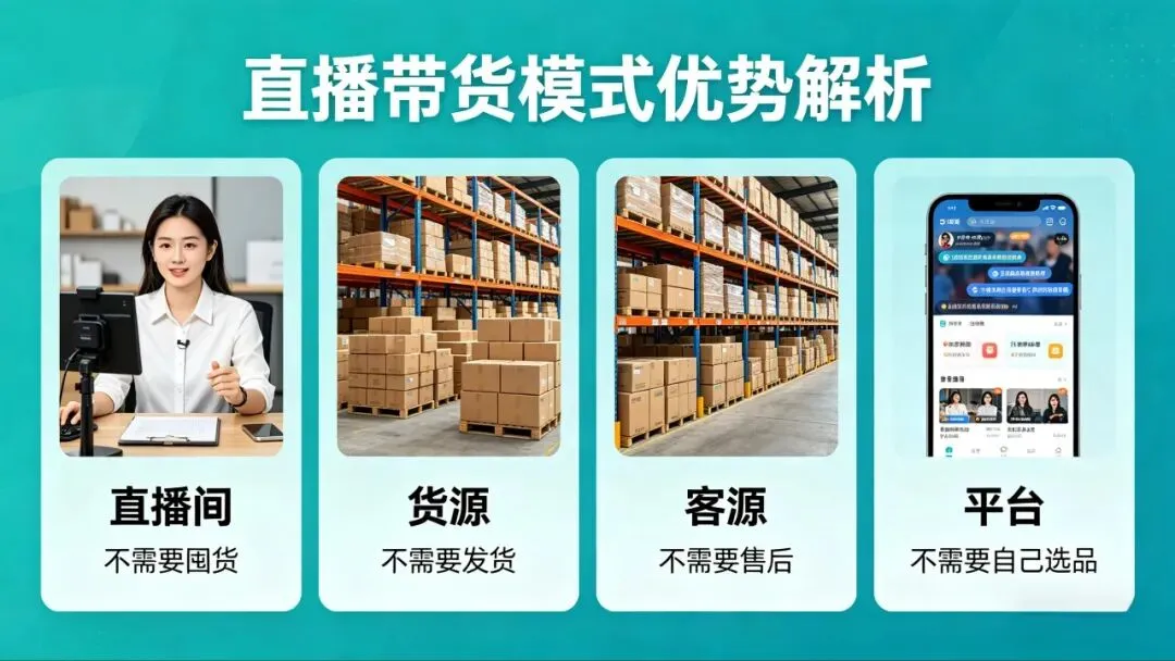 我们提供:直播间+货源+客源+平台。你不需要囤货、不需要发货、不需要售后、不需要自己选品。