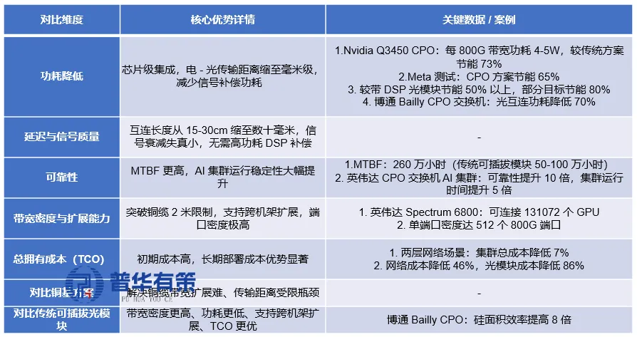 应用场景方面,由于服务器在总功耗和总成本中占据主导份额,在Scale-out侧CPO对成本和功耗的优化有限(三层网络架构下总功耗-2%、总成本-3%)。业界共识CPO将率先在AI集群Scale-up网络大规模落地,核心逻辑在于性能与能效刚需(面对GPU激增的I/O需求,CPO打破ASIC边缘物理密度极限)以及封闭生态降低阻力(Scale-up如NVLink属专有封闭体系,头部厂商通过垂直整合即可闭环落地)。