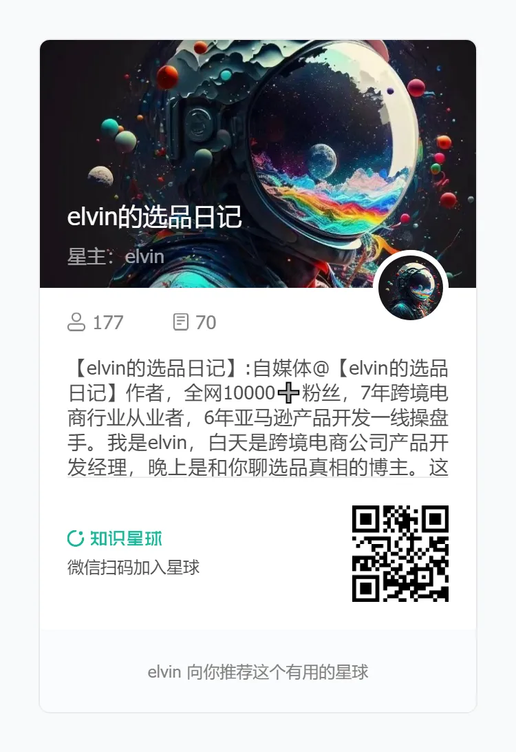 “我是Elvin,一位不愿躺平的95后。是和你聊选品真相的产品开发博主。这里没有“速成爆款’,只有长期主义的选品思考日记。我在这里不定期分享亚马逊真实选品案例,解锁、获取海量市场调研报告请扫码加入知识星球:elvin的选品日记