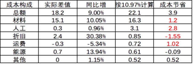 如果成本与营收一样,同比增长11%,进行比较: