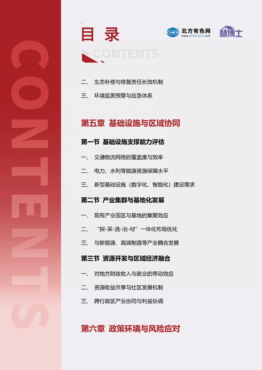 本报告基于翔实的数据与案例分析,遵循“战略分析-现状评估-路径设计”的逻辑框架,首先系统梳理了西部主要省区的资源禀赋、分布格局与资源潜力;全面评估了当前勘探开发进展、技术能力、产业链协同水平以及面临的生态约束。进而,报告深入剖析了在基础设施、产业协同、政策制度、技术创新等关键领域的现状、问题与需求。通过借鉴国内外资源型地区开发经验,并结合西藏铜矿、川西锂矿、新疆产业集群等典型实践,报告明确了西部地区有色金属资源开发的战略定位,即打造国家战略资源保障区、绿色开发示范区与产业创新策源地。