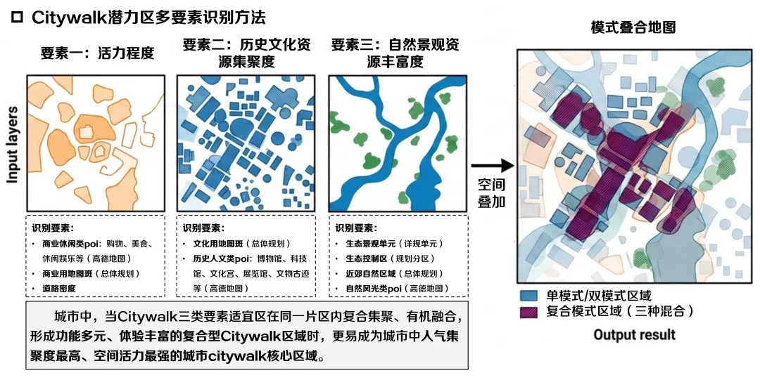 通过不同要素因子识别Citywalk潜力区,划定城市适宜步行区。依托GIS 空间分析技术,选取活力休闲、历史人文、自然景观三大核心要素,分别遴选差异化的要素因子开展量化识别,通过多因子空间叠加分析,精准识别各类 Citywalk特色潜力区域,最终综合划定多元类型的Citywalk片区。