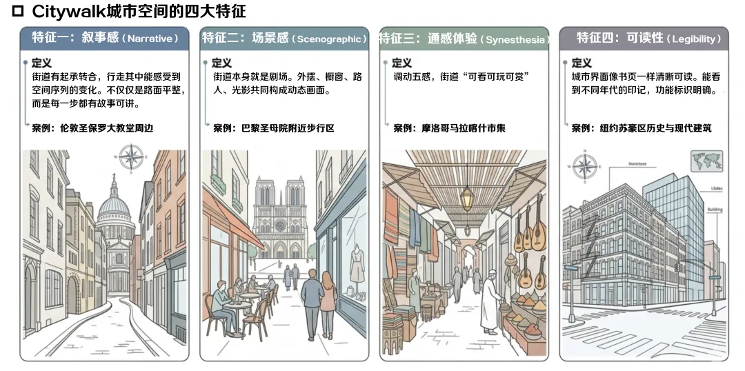 聚焦五大空间规划策略,打造具有叙事感、场景感和可读性的Citywalk空间。规划策略聚焦从道路规划到街道设计、再到场景打造,提出五大核心思路全方位提升步行体验:包括推动用地与业态多元复合、构建安全连续的步行网络、打造尺度宜人的街巷空间、完善智慧人本服务设施、营造独具地域魅力的公共场景。