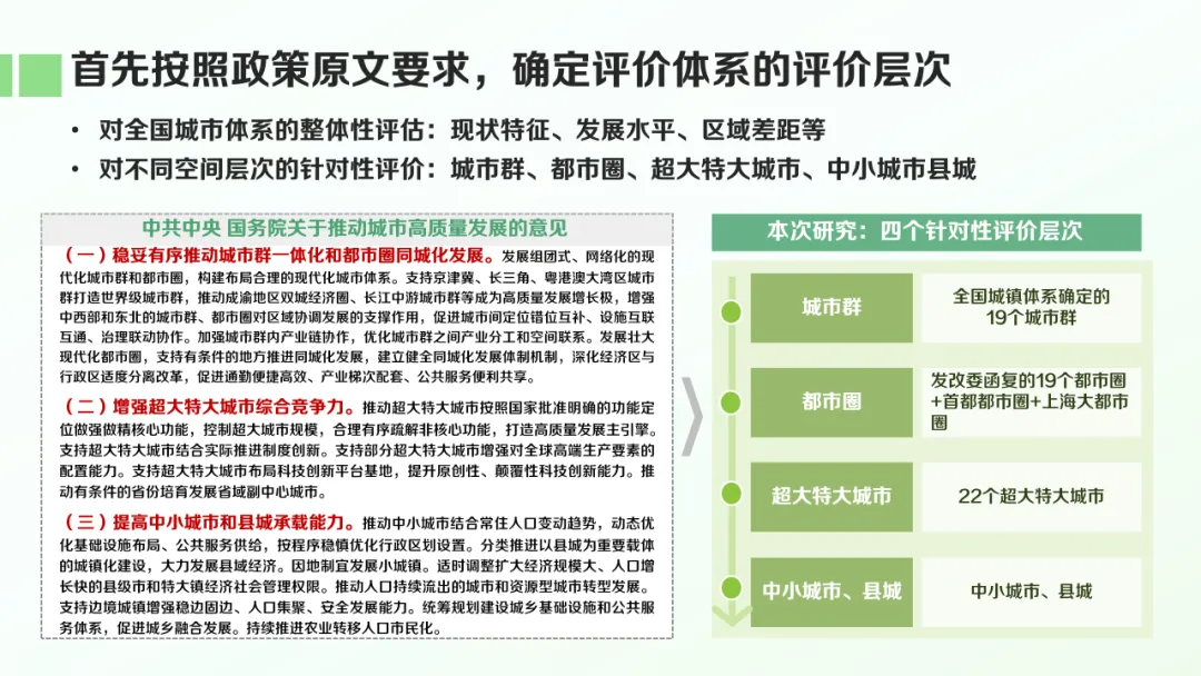 报告紧扣中央相关文件要求,聚焦 “城市群、都市圈、超大特大城市、中小城市及县城”四个空间层次为评价对象,按照城市发展新阶段的发展趋势和发展要求,明确五类差异化的评价维度,筛选关键性评价指标,构建出一套评级体系。