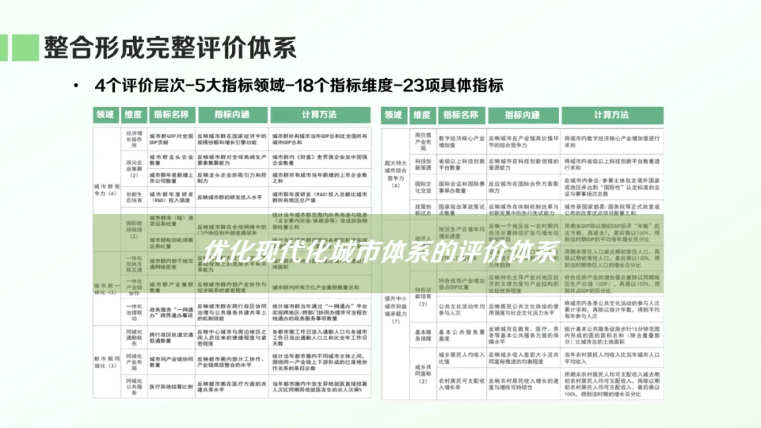超大特大城市层面,重点提升综合竞争力。引导超大特大城市代表国家参与全球竞争,聚焦高价值产业、科技创新策源、国际文化交流与政策创新试点,选取数字经济核心产业增加值等特色指标。