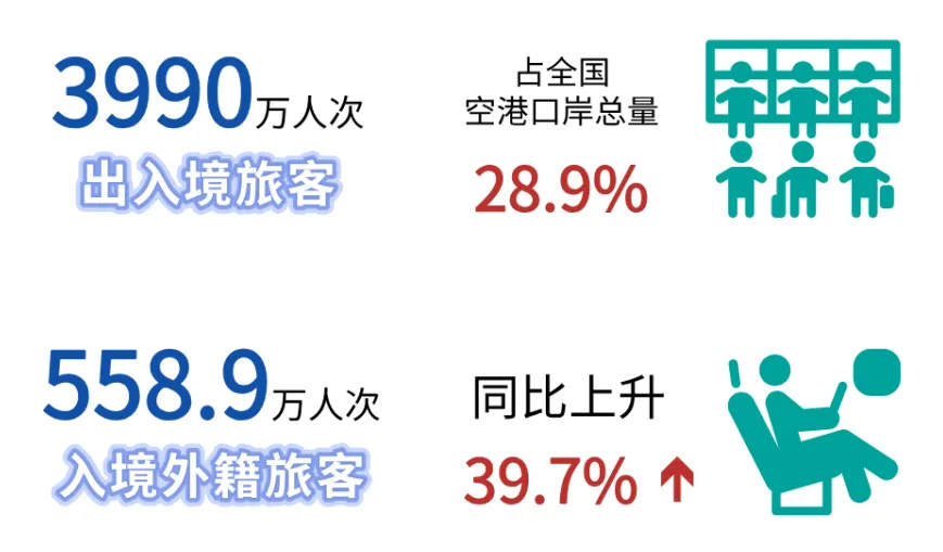 出入境旅客规模持续领跑,全年达3990万人次,占全国空港口岸总量28.9%,连续23年位居全国第一。