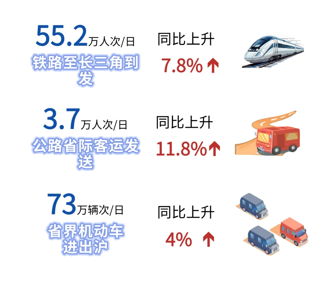 2025年,上海与长三角地区铁路日均旅客到发量55.2万人次/日,公路省际日均发送量3.7万人次/日,省界机动车进出沪日均流量约73万辆次/日,三者同比均有不同程度上涨。