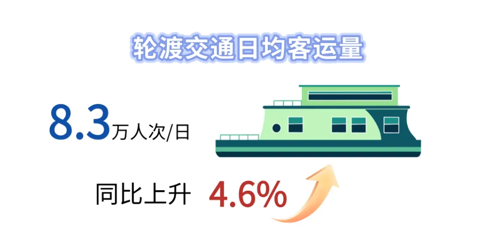 轮渡交通(含黄浦江轮渡及三岛轮渡)保障越江功能,以服务非机动车通勤、配送为主,也吸引了沿江的休闲旅游出行,日均客运量8.3万人次,同比增长4.6%。