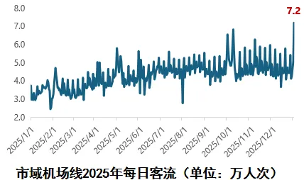 2025年12月,市域机场线进入4编组、8编组、“4+4”重联编组协同运营的“灵活编组”新阶段,实现运力按需灵活调配,高效应对日常及高峰时段的客流变化。客流高峰多集中于周五、节假日前一日或最后一日:中秋国庆假期10月8日客流6.8万人次,12月31日客流攀升至7.2万人次,创线路开通以来新高。