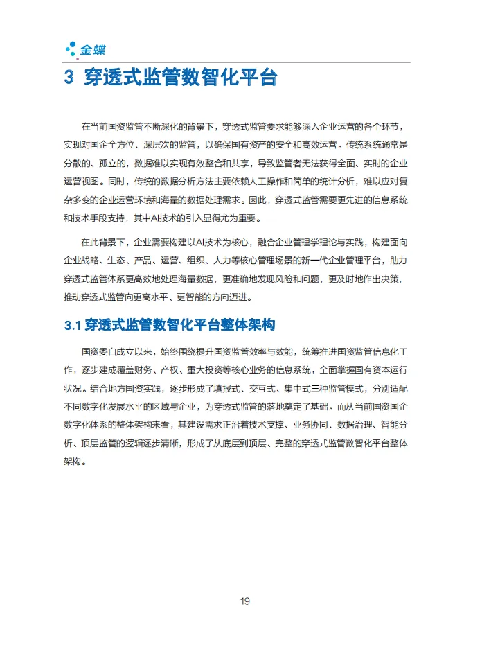 在政策指引与市场需求的双重驱动下,金蝶凭借30余年服务央国企的深厚经验,依托自身在财务数智化领域的技术积淀,联合北京国家会计学院的专业研究力量,发布《国资国企穿透式监管白皮书》(第三版),系统梳理了穿透式监管的政策解读、实践路径与典型案例,为央国企提供了可落地、可复制的参考方案。