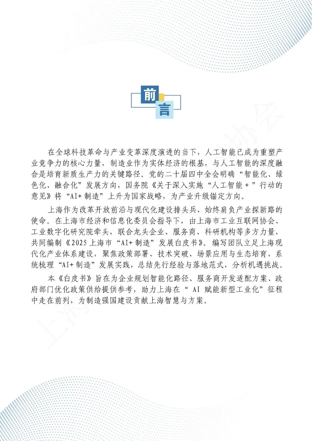 本《白皮书》旨在为企业规划智能化路径、服务商开发适配方案、政府部门优化政策供给提供参考,助力上海在“ AI 赋能新型工业化” 征程中走在前列,为制造强国建设贡献上海智慧与方案。