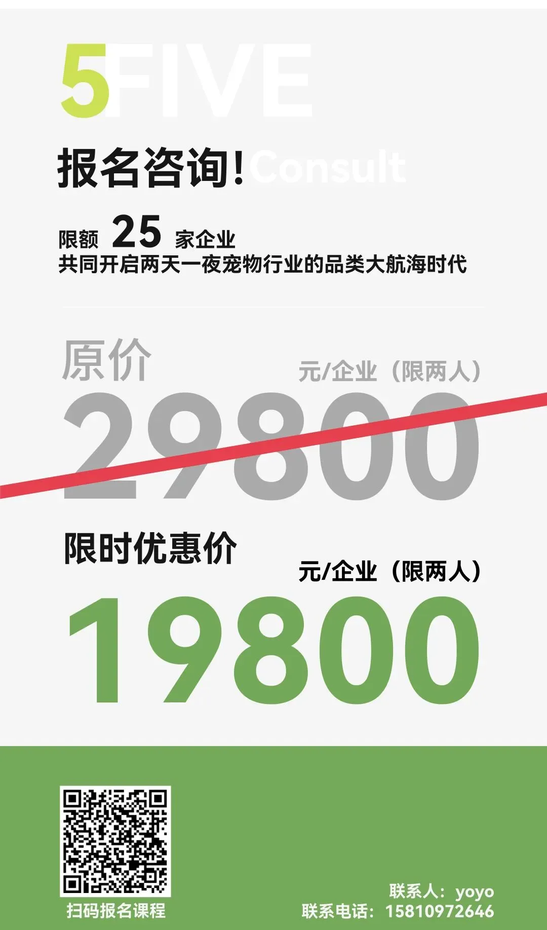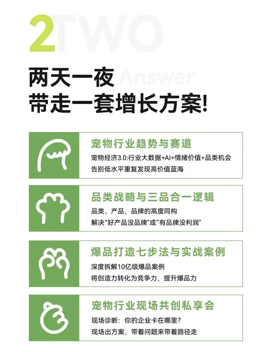 精准匹配以下人群:宠物食品、用品、服务、零售、医疗、大健康等领域的企业创始人/高管;增长见顶、急需下一代爆品的品牌操盘手;不甘只做代工、渴望自主品牌破局的生产型企业;融资后急需建立护城河的创业公司;以及跨界进入宠物行业、希望找到品类切入点的外部企业。只要你不想再内卷,希望定义一个新品类、拿下属于自己的利润区,这门2天1夜的实战营就是为你准备的。