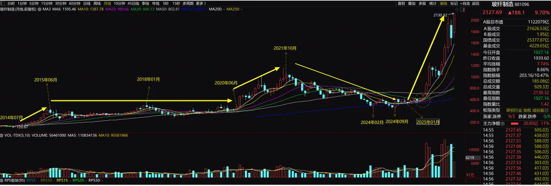 - 2026年4月当前位置进入复苏中期偏上、向紧俏切换的关键窗口。2026年初电子布第二轮涨价启动(月度调价10-15%预期),7628厚布主流报价已达5.5-6.5元/米;粗纱/风电纱价格中枢稳定上移;龙头2025年报显示销量与利润高增(中国巨石粗纱320万吨+、电子布10.62亿米)。行业库存维持低位,头部企业产销率接近满产,价格中枢较2023低点已上移20-30%。指数从2025低位快速拉升至2130.32点附近,最新月K线收出大阳线(+9.70%),成交量显著放大(主力净流入20.93亿),MACD、均线系统(MA3/MA10/MA20)金叉向上,完全对应“供需紧平衡向紧俏切换”+价格中枢上移的量价齐升确认阶段。