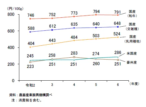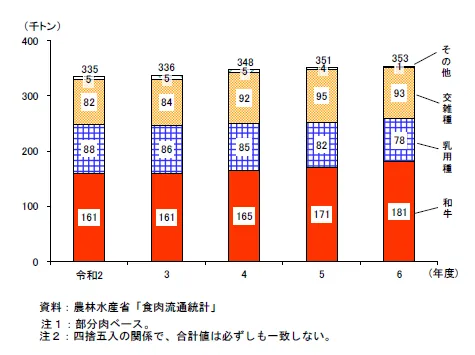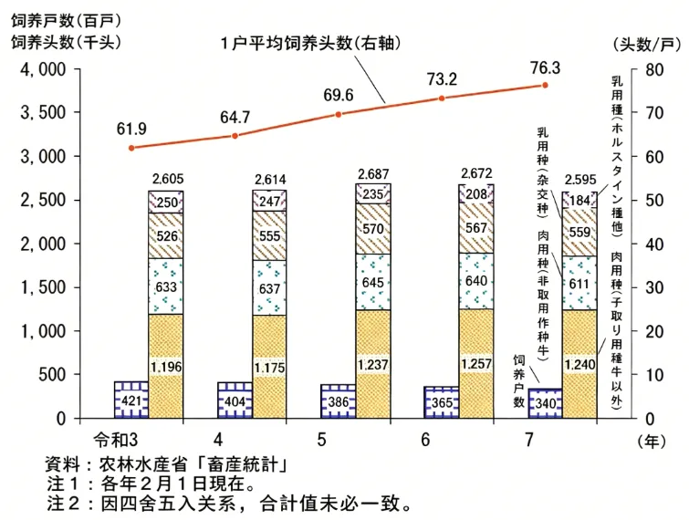 数据来源:日本农林水产省《畜産統計》《食肉流通統計》、財務省《貿易統計》、総務省《家計調査報告》、農畜産業振興機構調べ(2024–2025年)。单位换算按1日元≈0.05元人民币估算。