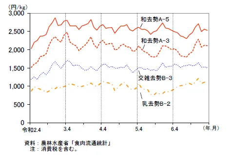 纯血和牛种源的重要性在此凸显,黑毛和种犊牛价格远高于杂交种(高出约63%),且即使在总体饲养头数下降的背景下,和牛产量依然逆势增长5.8%。这说明,拥有纯正血统、具备优秀大理石花纹潜力的犊牛,才是产业溢价能力的根基。