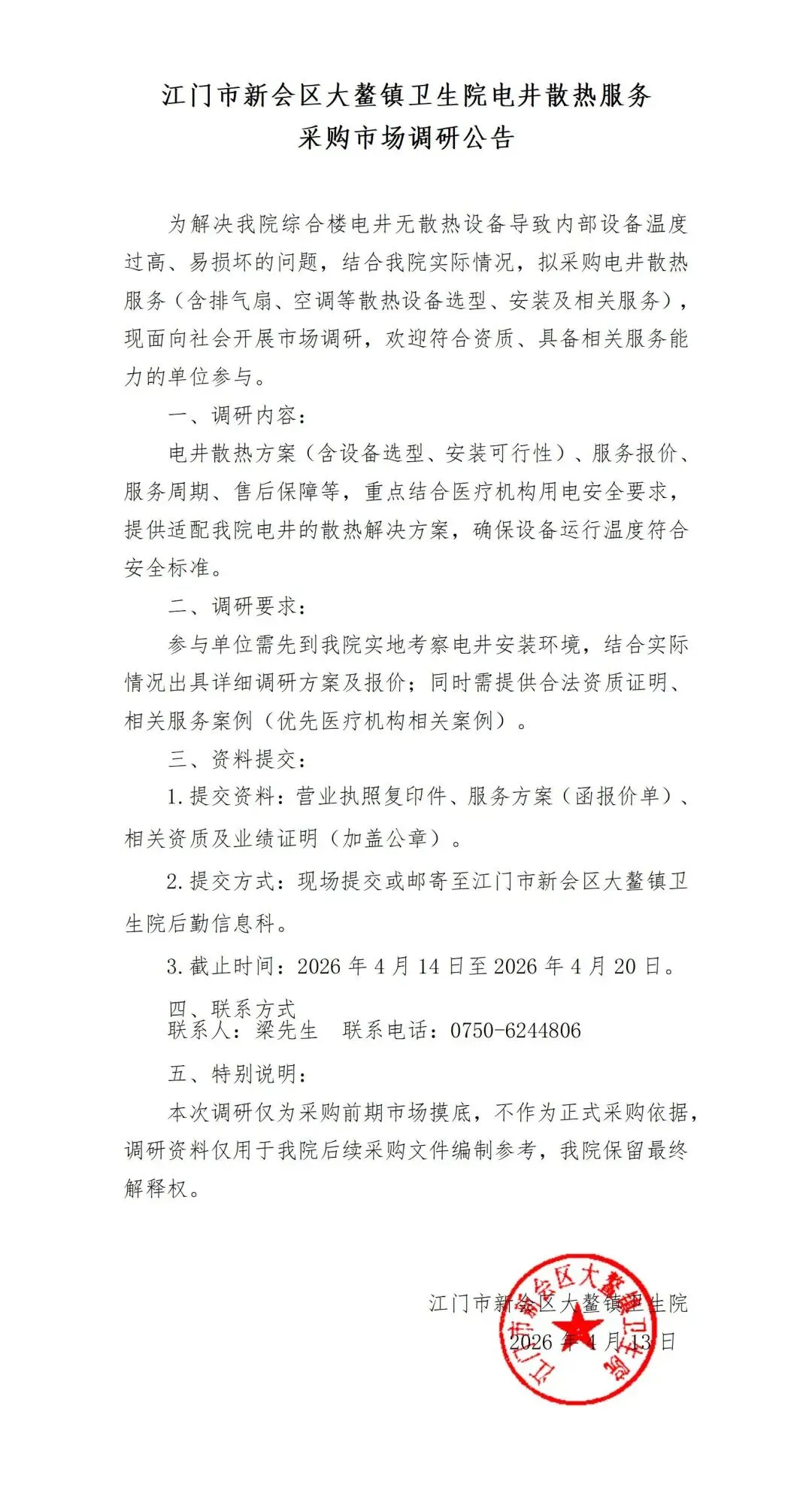 【调研公告】江门市新会区大鳌镇卫生院电井散热服务采购项目公告