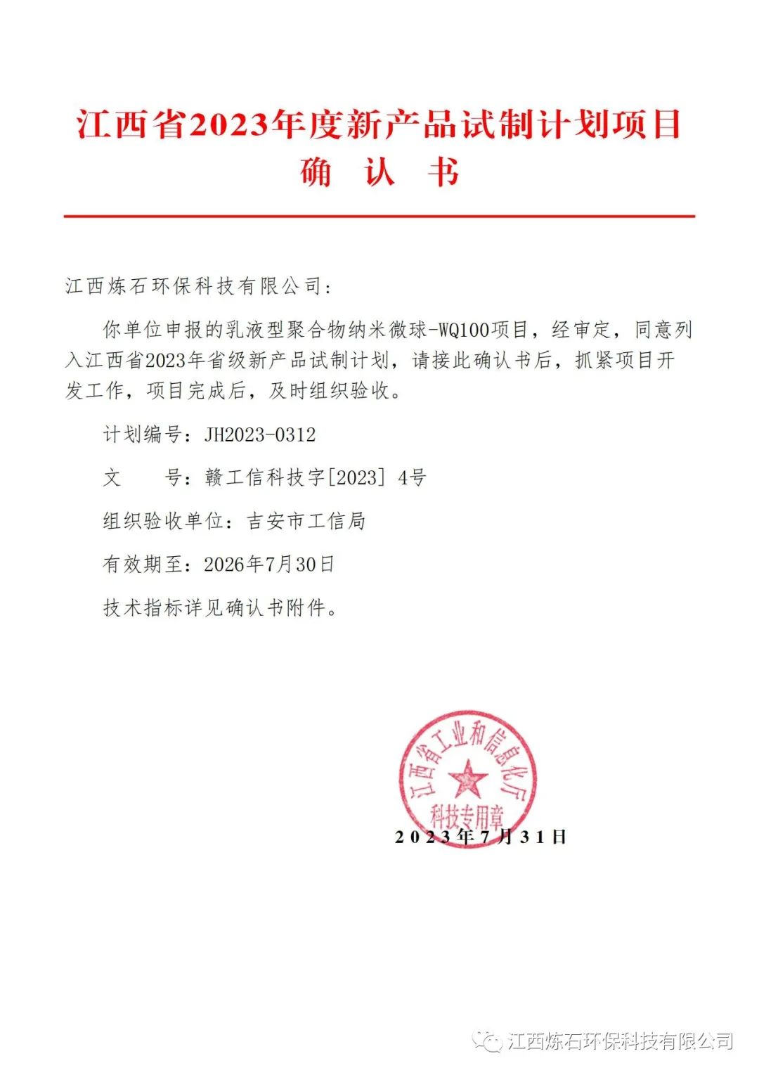 公司研发中心传来捷报,研发中心最新又成功研制出一新产品:乳液型聚合物纳米微球---WQ100,并提交江西省工信厅列入江西省2023年省级新产品试制计划项目,这是公司今年列入省级新产品试制计划第二个项目。