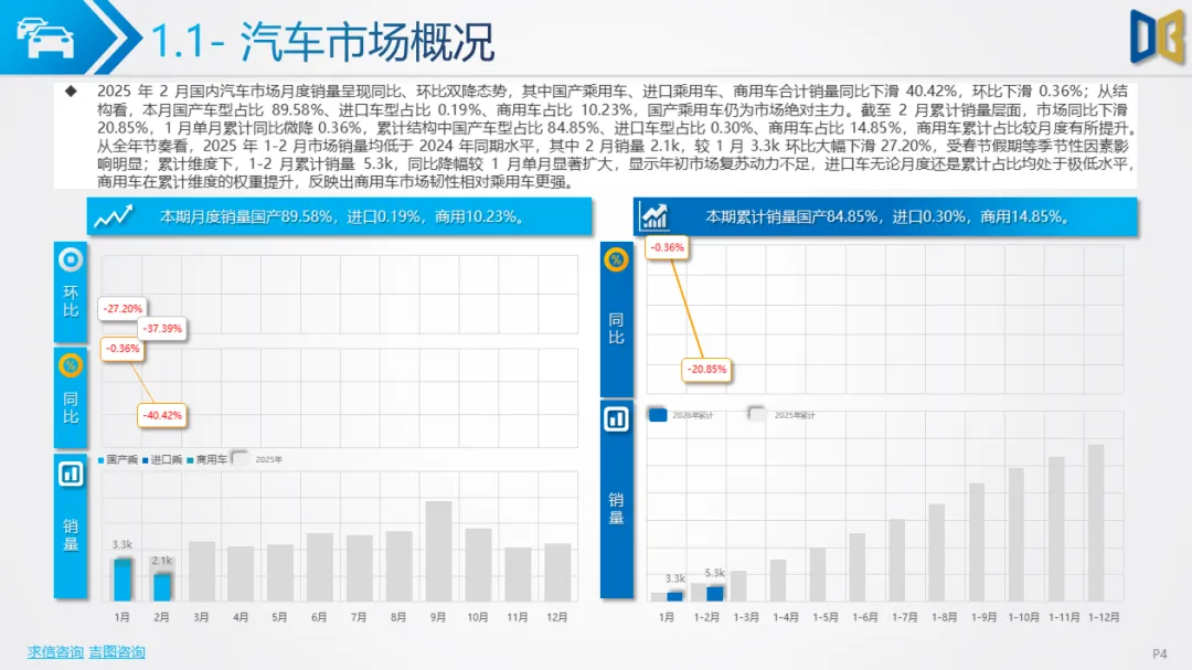 2026 年 1-2 月大同市汽车市场整体呈现全面下行、需求疲软态势,国产乘用车占据绝对主导,进口车市场近乎停滞,商用车波动调整,全品类销量同比、环比双下滑,市场复苏动力严重不足。