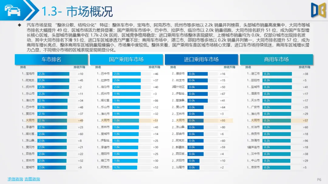 整体来看,大同车市呈现国产主导、进口归零、商用车承压的格局,消费向 SUV、头部自主、中高端车型集中,全市场受需求收缩影响下行,后续复苏需依托政策刺激与消费信心修复。