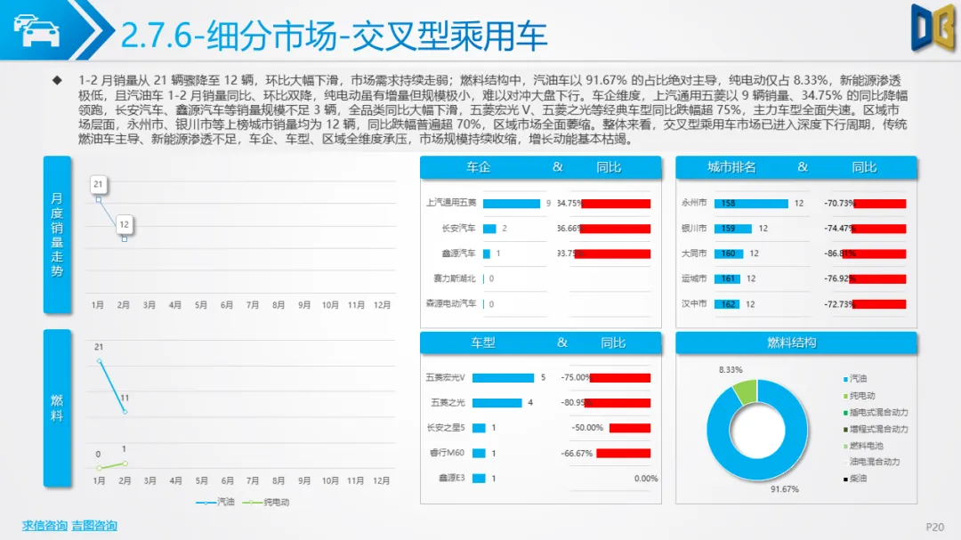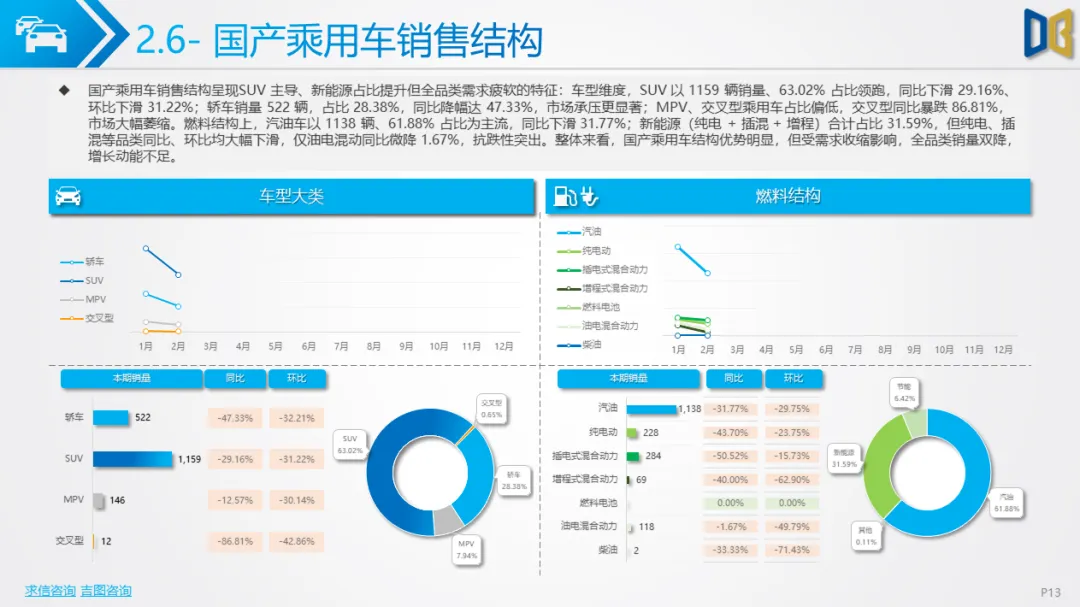 国产乘用车作为市场核心,1-2 月累计销量 4524 辆,同比下滑 22.44%,2 月降幅进一步扩大;结构上 SUV 占比超 63% 为主力,轿车承压明显,汽油车占 61.88%,新能源占比 31.59% 但全品类下滑,动力以 1.5L+CVT/7DCT 小排量高效组合为主流,品牌端自主占比 58.12%,长城、比亚迪领跑,仅少数合资品牌实现正增长,区域高度集中于平城区,占比达 83%,所有区县销量均同比下滑。