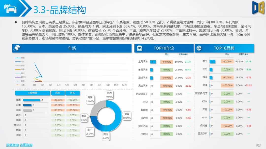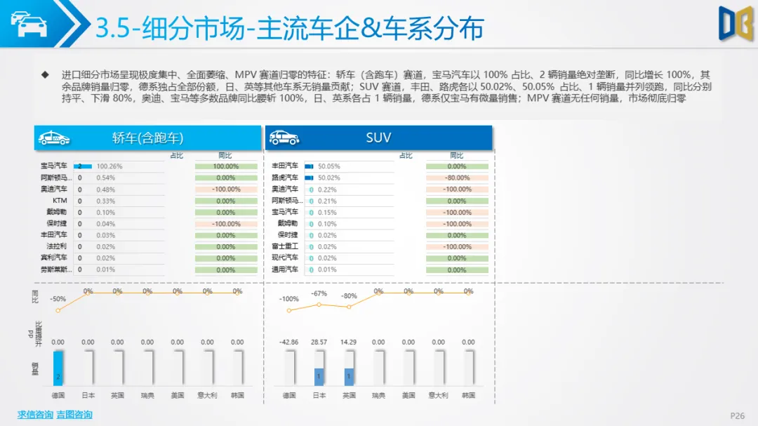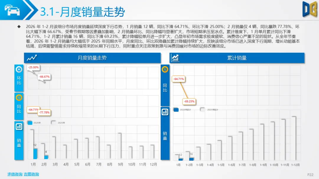 进口乘用车市场极度萎缩,1-2 月累计仅售 16 辆,同比大跌 69.23%,由德系宝马、日系丰田、英系路虎垄断,100% 为汽油车,新能源完全空白,市场结构高度单一。