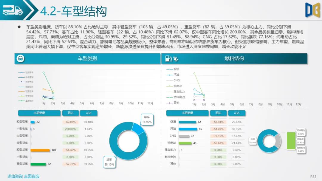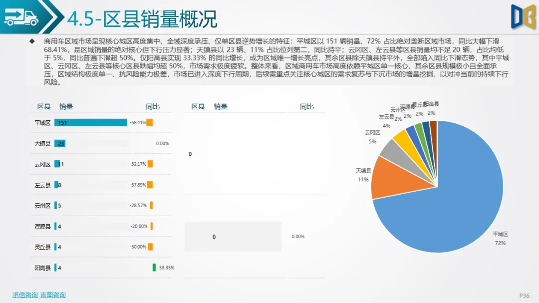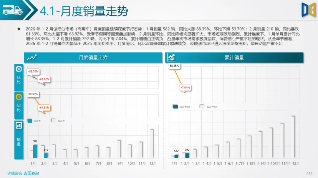 商用车市场波动剧烈、深度调整,1-2 月累计销量 792 辆,同比下滑 7.04%,货车占比 88.10%,轻卡、重卡为核心,柴油、汽油为主,新能源占比偏低,中国重汽、北汽福田领跑,仅少数品牌逆势增长,平城区占 72%,仅阳高县实现增长,其余区县全面下滑。