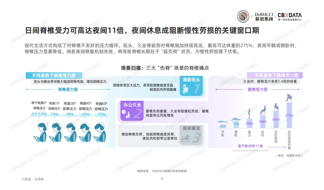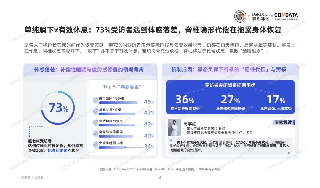 核心问题不在睡眠时长不够,而是夜间脊椎处于隐性代偿状态,肌肉没法彻底放松,身体在睡眠中仍承担着日间的部分负荷,没法完成真正的修复。数据也印证了这一点,超七成人群构建泛睡眠周期延长卧床时间,却有73%的人遭遇睡眠与恢复效果脱节。36%的人是因为找不到舒适睡姿,34%是本身脊椎状况不佳,引发夜间脊椎代偿。而且日间脊椎所受压力可达夜间的11倍,夜间修复机制一旦失效,日间的劳损没法缓解,就会慢慢形成慢性损伤,陷入越睡越累的循环。