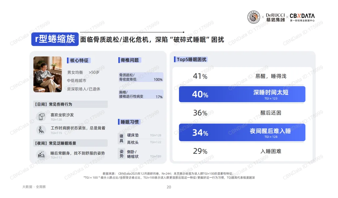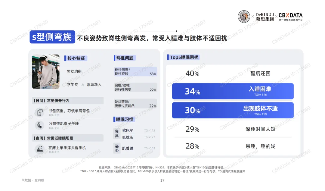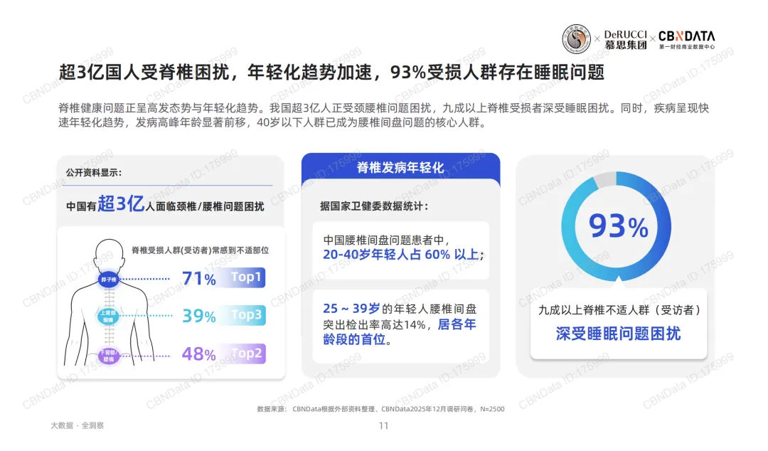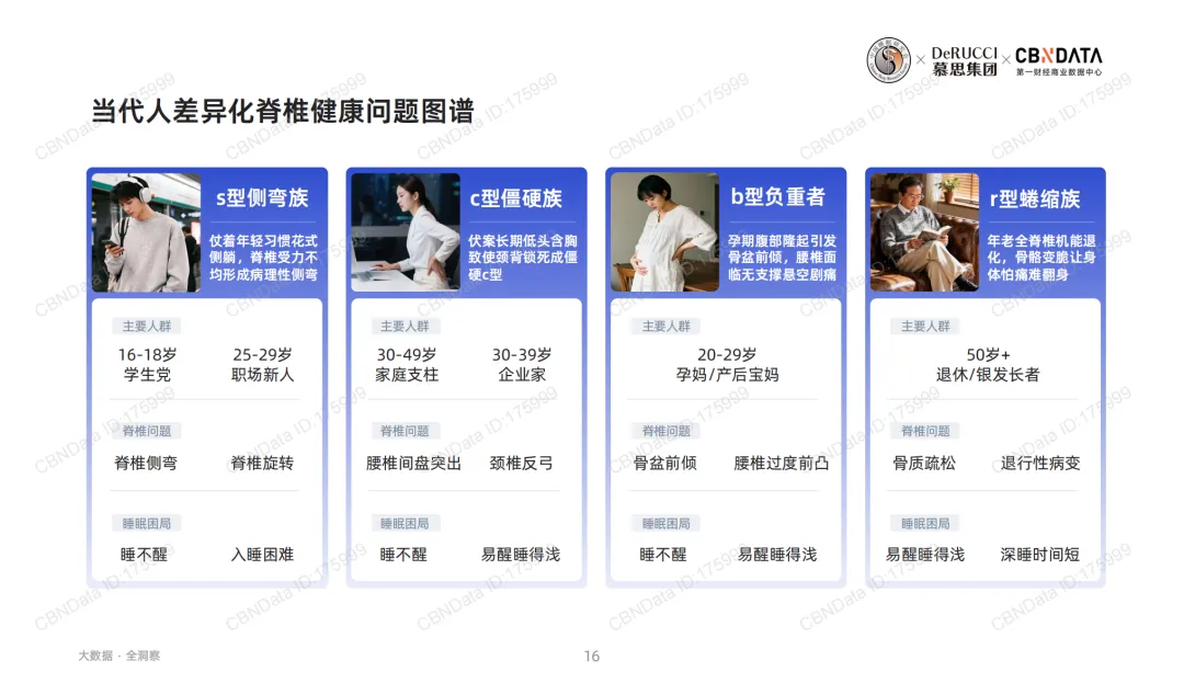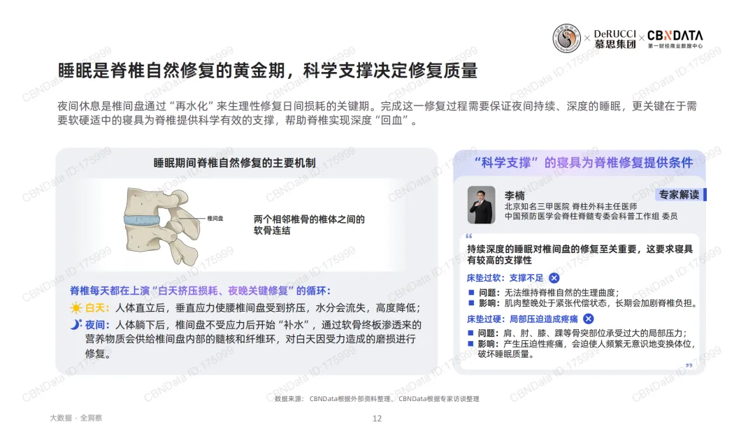 它不再是单纯追求睡得久或感官舒适,而是以脊椎修复为核心的质量管理阶段。健康观念上,从过去觉得无病就好、身心放松即可,升级为主动科学管理健康,把健康当作高效生活的基础。睡眠诉求上,不再只满足于有觉睡能消困、睡得香体感舒适,转而追求睡得好,看重睡眠带来的生理修复和身体效能优化,更在意醒来后头脑清醒、身体轻松的双重状态。对寝具的要求也变了,从看重耐用实惠、材质与包裹感,转向强调支撑性和适配度,核心是能给脊椎科学精准的承托,匹配不同人的脊椎形态。