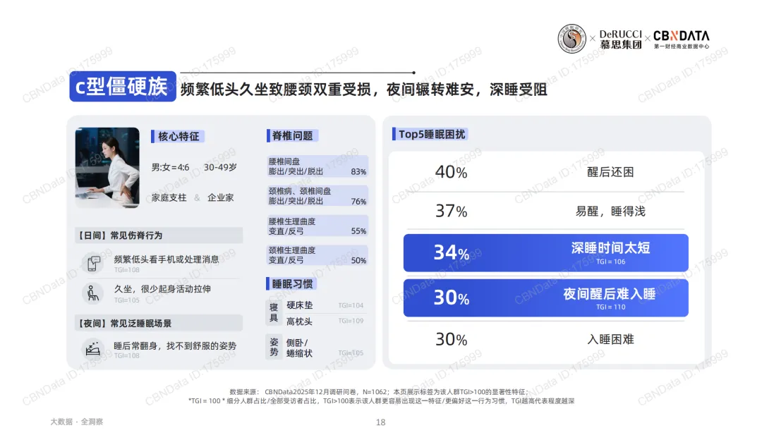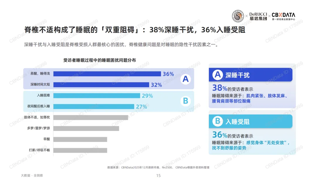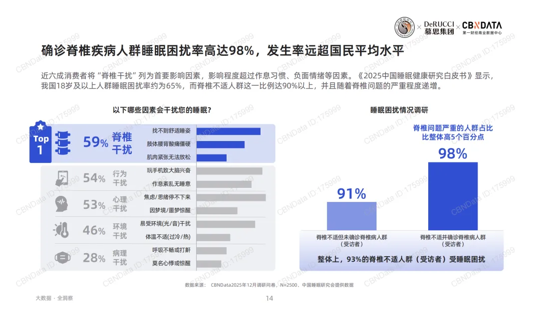 《2026脊椎健康与睡眠行业白皮书》揭示,当下国民健康观已转向追求身心俱佳的好状态,睡眠健康话题热度攀升,成为大众关注的健康新焦点。但现实不容乐观,国人平均睡眠时长缩至6.9小时,七成人群夜间易醒,超七成尝试延长卧床时间构建泛睡眠周期,却有超七成人群睡眠与身体恢复脱节。更严峻的是,超3亿人受颈腰椎问题困扰且持续年轻化,40岁以下人群成腰椎间盘问题核心,脊椎干扰已超越其他因素,成为影响睡眠的首要元凶。大众睡眠观正式迈入以质量为核心的3.0时代,多数人重视醒后状态、愿意为睡眠增加投入,也主动关注护脊,习惯纠正、睡眠修复与康复理疗成主流方式,而打造适配脊椎、精准支撑的睡眠环境,是解决睡眠与脊椎双重问题的关键。