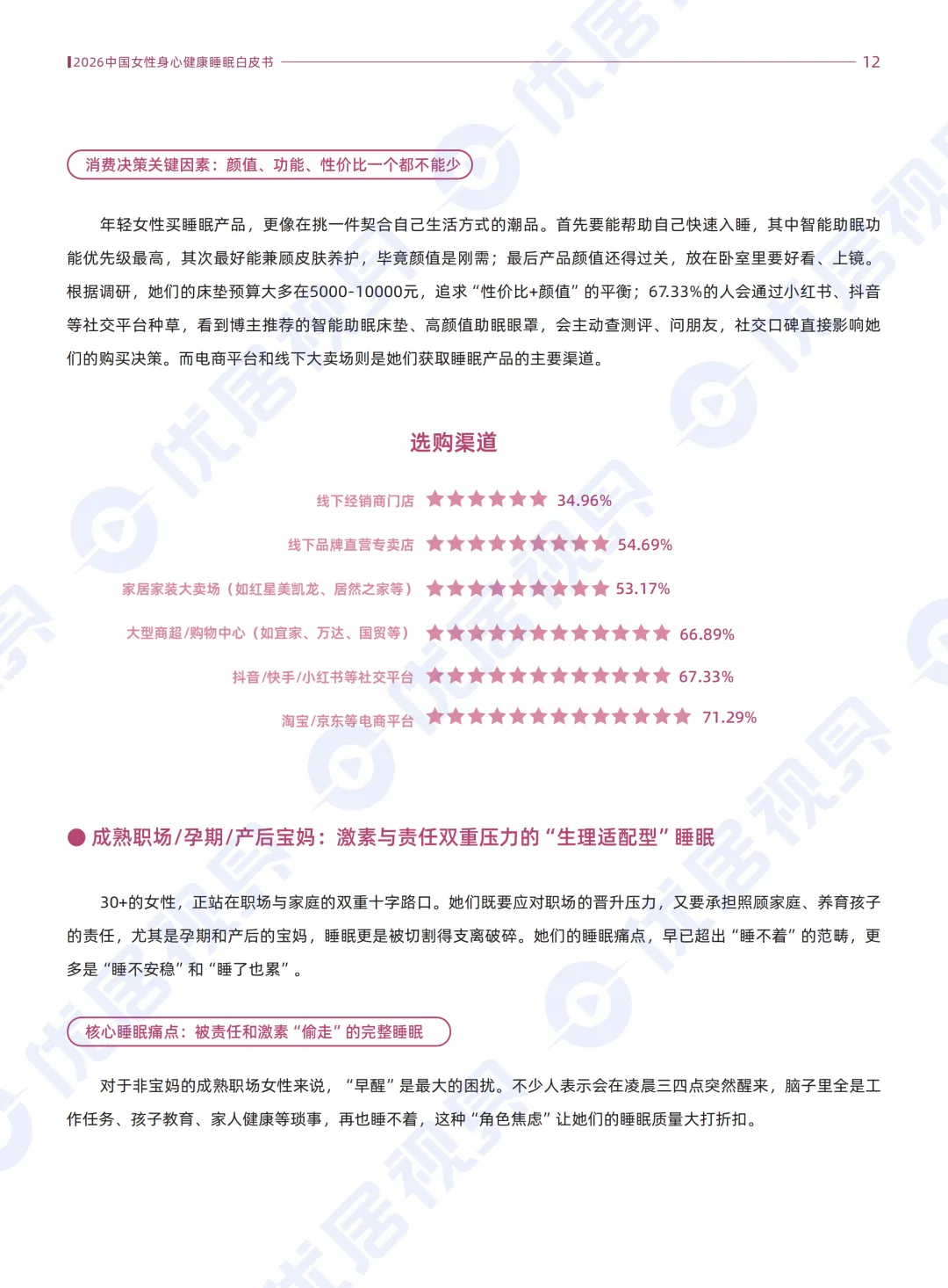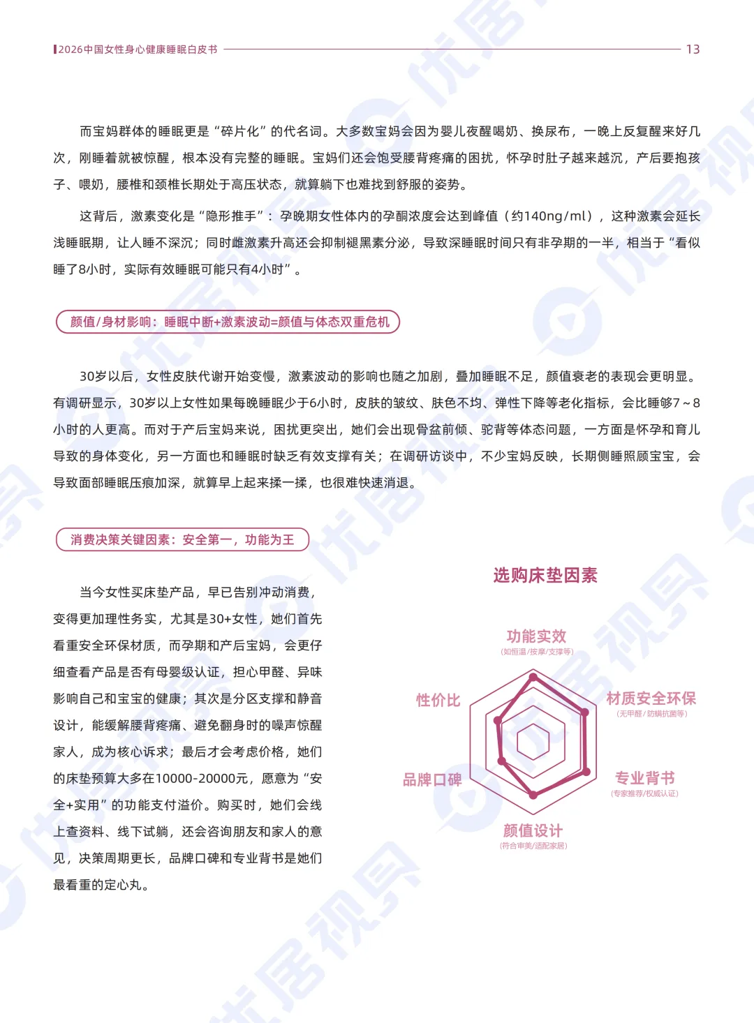 《2026中国女性身心健康睡眠白皮书》通过两千多份问卷,勾勒出25-55岁中国女性的睡眠困境与市场走向。当下超七成女性正受睡眠问题困扰,且困扰率明显高于男性。不同年龄与生理阶段的女性,睡眠痛点呈现明显分化。从年轻职场女性的情绪焦虑、颜值焦虑,到宝妈群体的睡眠中断、激素波动,再到更年期女性的生理不适、深度睡眠缺失,问题贯穿女性全生命周期。伴随她经济与睡眠经济的爆发,市场正从通用化产品转向人群专属化服务。蕾丝床垫等品牌也顺势推出精准方案,叠加政策对女性全周期健康的保障,整个女性睡眠赛道正朝着情绪赋能、全周期适配、抗衰美容融合的方向快速发展。