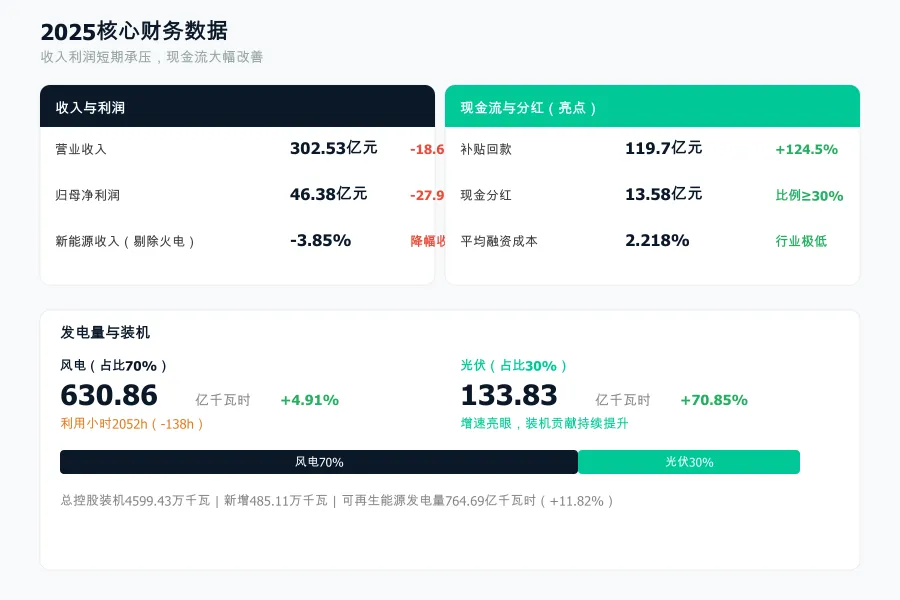2025年营收302.53亿元(-18.6%),归母净利润46.38亿元(-27.93%)。下滑主因三个:区域风速下降、限电率上升、火电资产处置。但剔除火电处置后,新能源收入仅-3.85%,核心业务没有失速