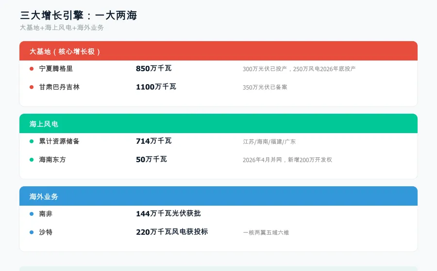 海外是长期故事。南非144万千瓦光伏获批,沙特220万千瓦风电获投标资格。"一核两翼五域六维"的战略框架,说明海外不是试水,是体系化推进。