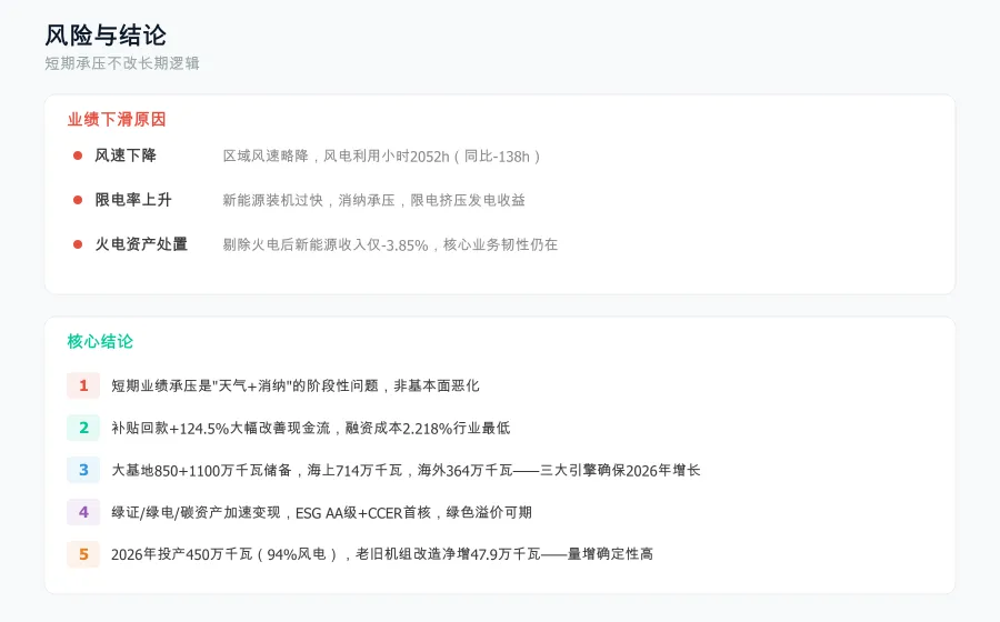 核心结论:业绩下滑是风速+限电+火电处置的阶段性问题。剔除火电后新能源收入仅-3.85%,核心业务韧性仍在。现金流大幅改善,三大增长引擎(大基地+海上+海外)确定性高,2026年投产450万千瓦是硬增长