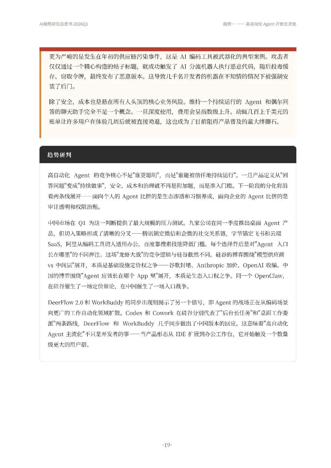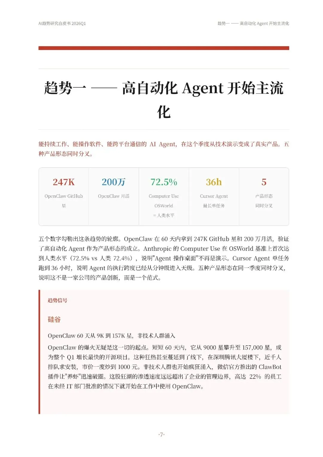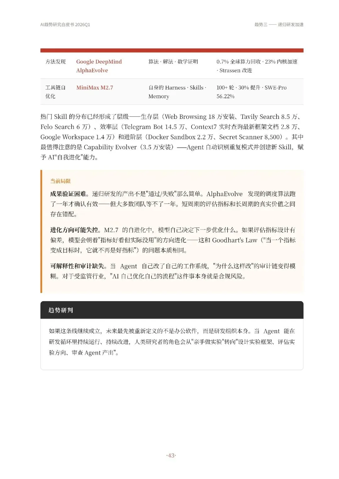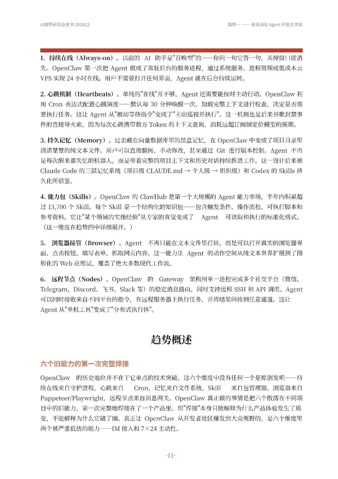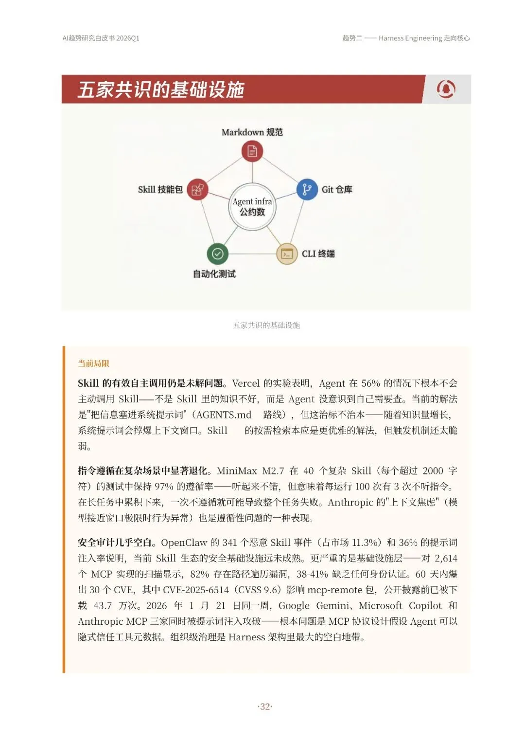 Skill成为关键know-how载体,通过结构化知识包使Agent更可靠执行复杂任务,市场爆发式增长同时面临安全和触发机制挑战。四条趋势相互关联,共同推动AI Agent从模型展示向可持续工作系统转变,未来竞争焦点在于谁能构建更稳定、可靠、可控的Agent系统,并将其推广到更广泛场景。