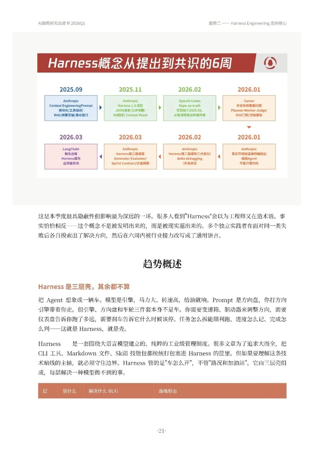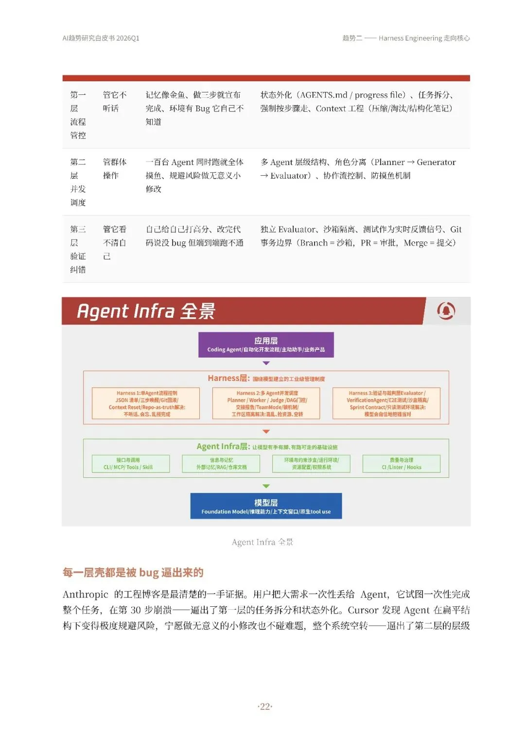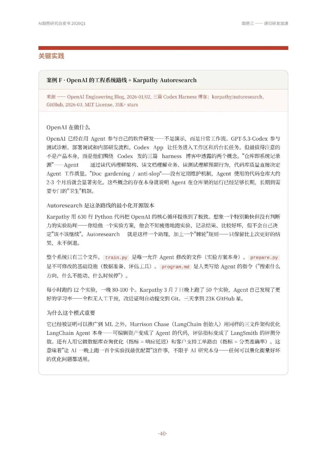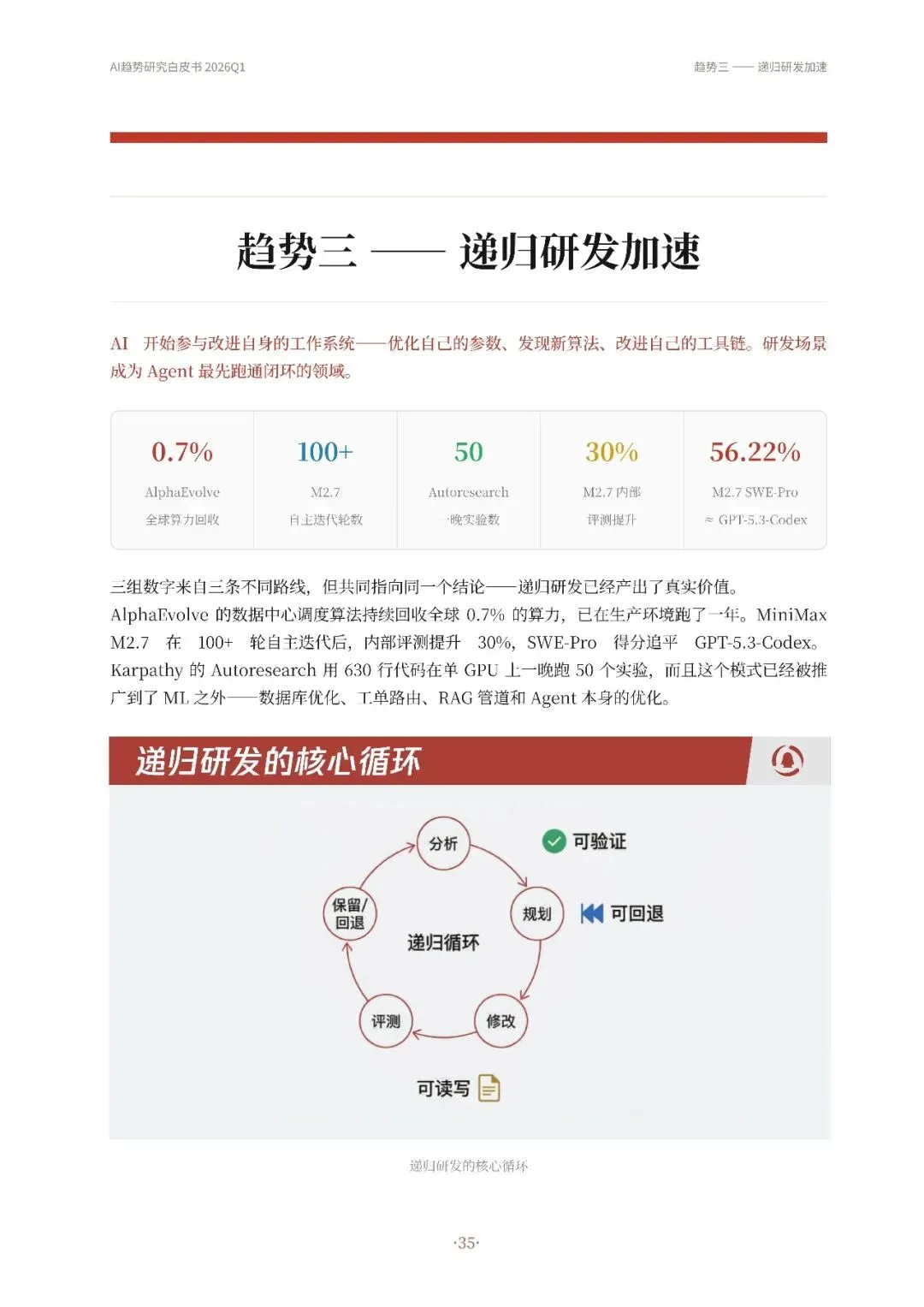 高自动化AI Agent成为主流,从技术演示转变为真实产品,如OpenClaw等实现持续运行和多平台通信。其次,Harness Engineering成为核心,通过流程管控、并发调度和验证纠错等机制,确保Agent稳定可靠工作。第三,递归研发加速,AI开始参与改进自身工作系统,优化算法和工具链,形成研发闭环。