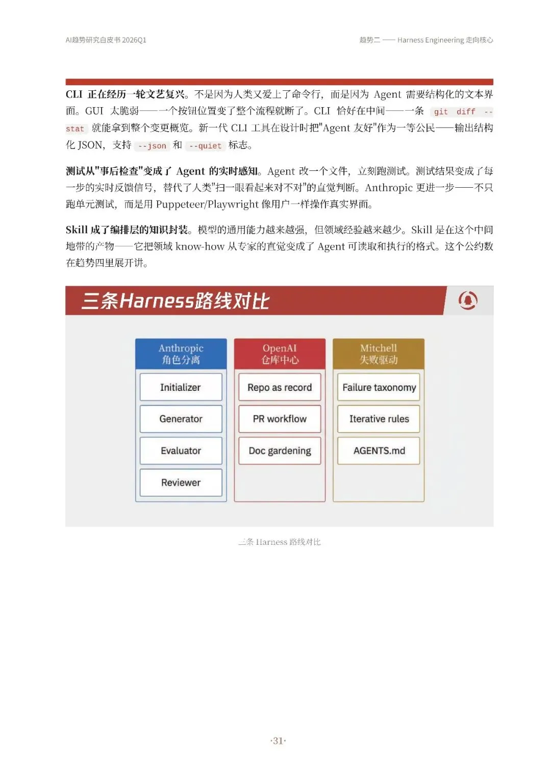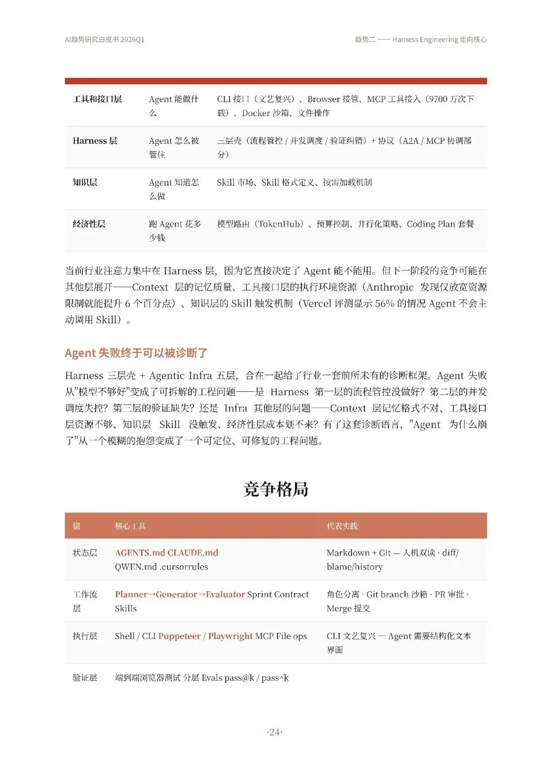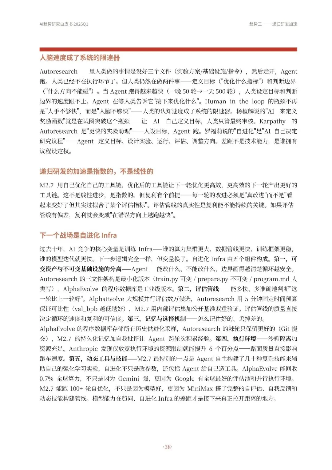 高自动化AI Agent成为主流,从技术演示转变为真实产品,如OpenClaw等实现持续运行和多平台通信。其次,Harness Engineering成为核心,通过流程管控、并发调度和验证纠错等机制,确保Agent稳定可靠工作。第三,递归研发加速,AI开始参与改进自身工作系统,优化算法和工具链,形成研发闭环。