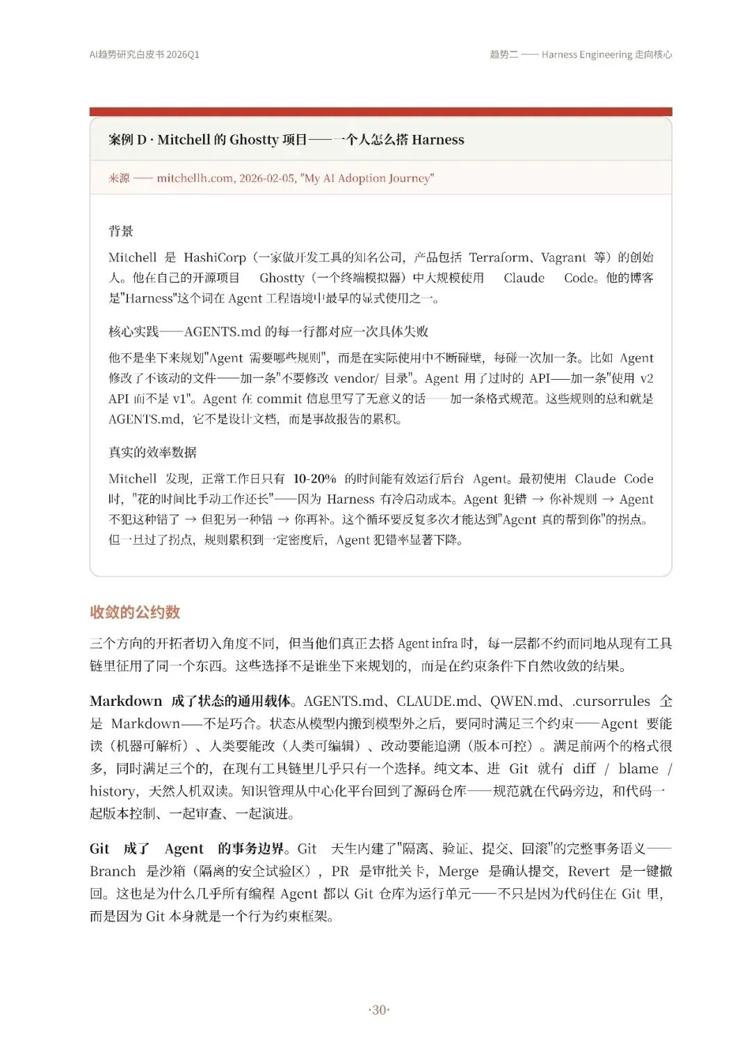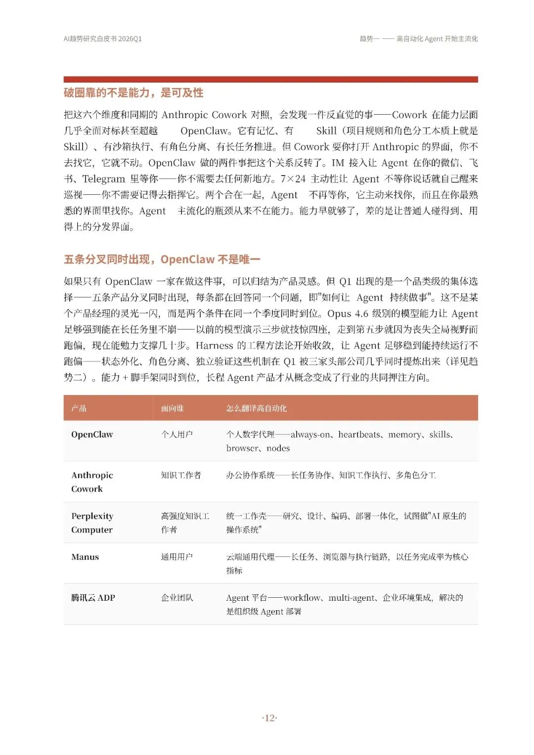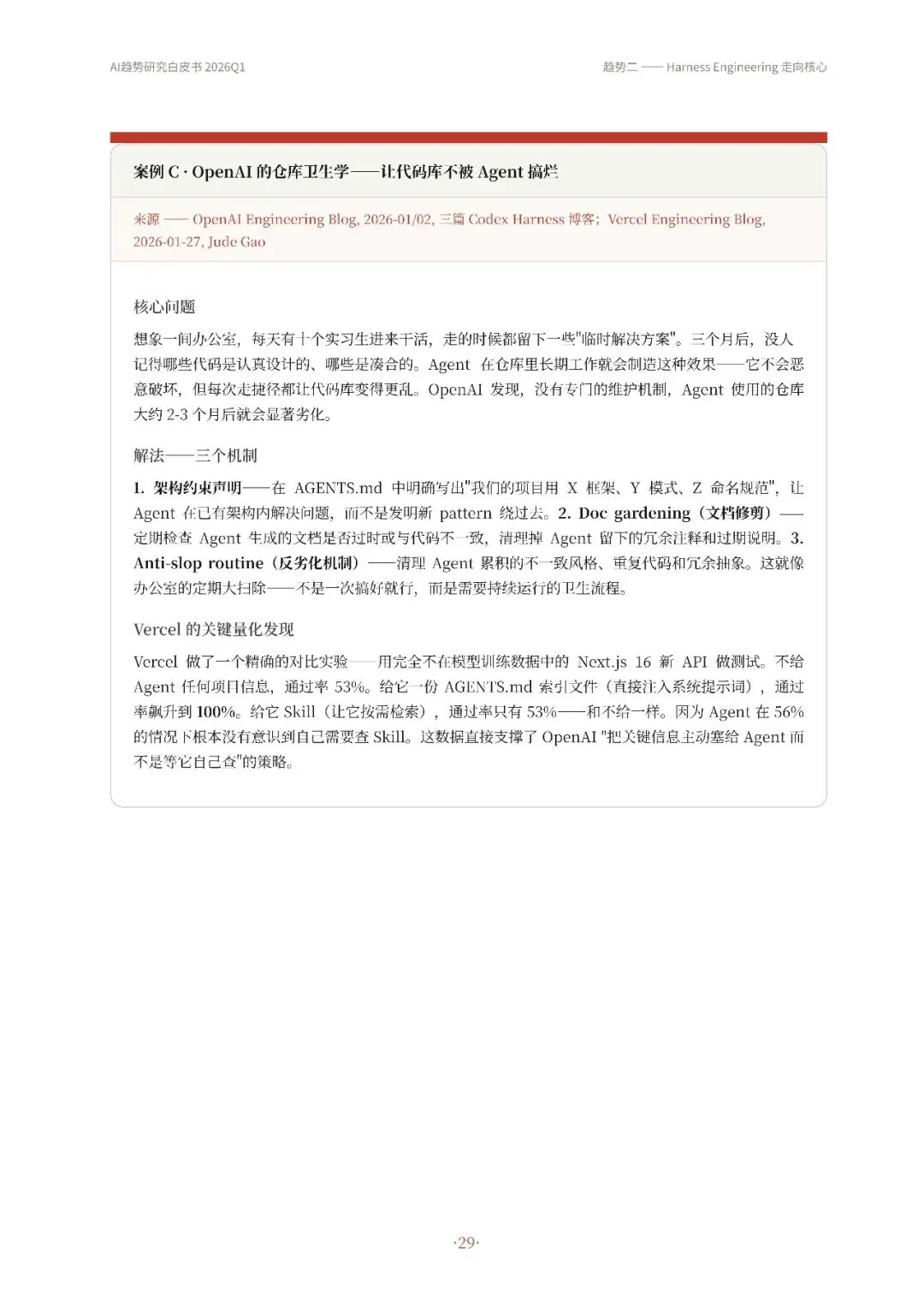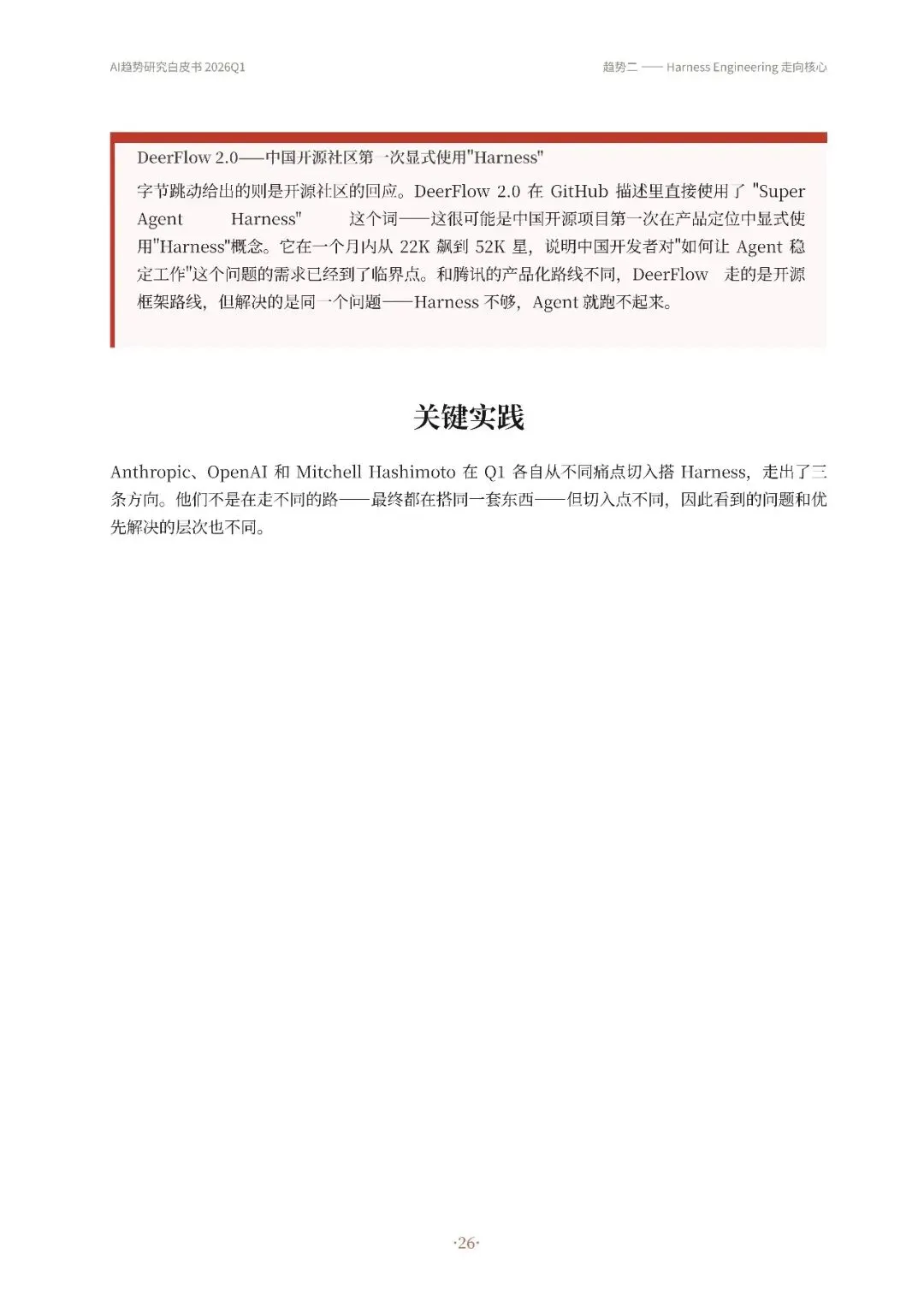 高自动化AI Agent成为主流,从技术演示转变为真实产品,如OpenClaw等实现持续运行和多平台通信。其次,Harness Engineering成为核心,通过流程管控、并发调度和验证纠错等机制,确保Agent稳定可靠工作。第三,递归研发加速,AI开始参与改进自身工作系统,优化算法和工具链,形成研发闭环。