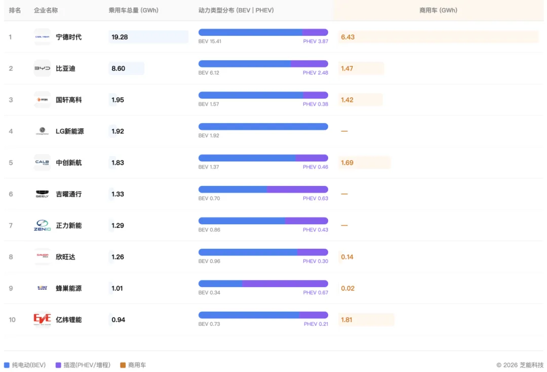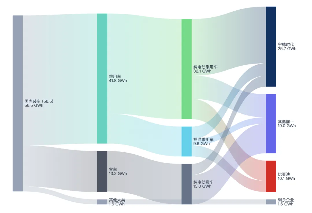 ◎ 宁德时代乘用车装车19.28GWh,BEV 15.41GWh、PHEV 3.87GWh;商用车6.43GWh。