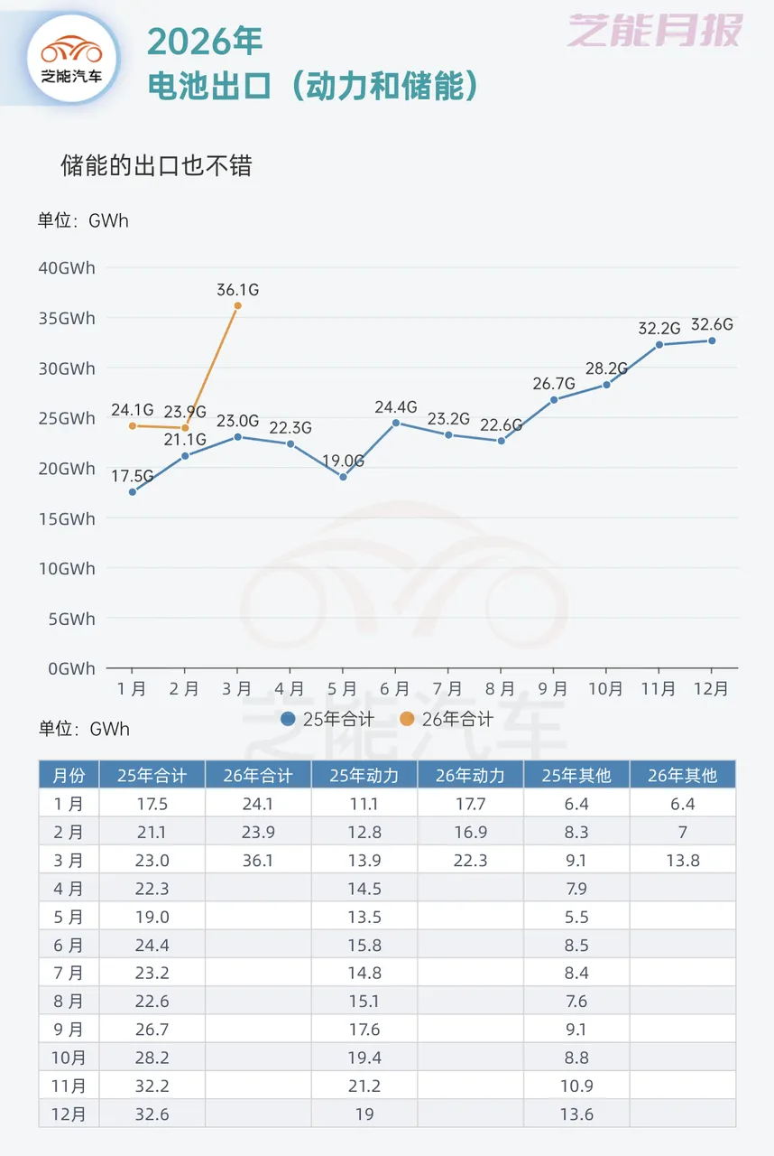 ● 3月电池合计出口36.1GWh,同比增长57.1%,占当月销量20.6%。