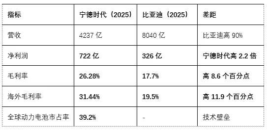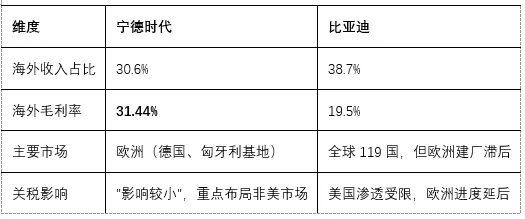关键差异:宁德时代海外毛利率比国内高7.4个百分点,比亚迪仅高2.8个百分点。
