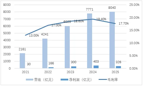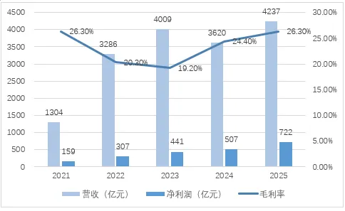 2021-2024年营收翻3.6倍,但2025年增速骤降至3.5%,利润下滑19%。