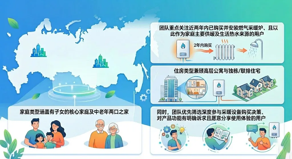 团队重点关注近两年内已购买并安装燃气采暖炉、且以此作为家庭主要供暖及生活热水来源的用户,住房类型兼顾高层公寓与独栋/联排住宅,家庭类型涵盖有子女的核心家庭及中老年两口之家。