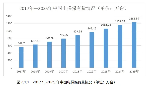 据国家市场监管总局公布新数据显示,截至2025年年底,我国电梯保有量达1231.59万台,中国电梯保有量从2017年的562.7万台上升至2025年的1231.59万台,年复合增长率为10.29%。电梯存量市场规模(保有量)约占全球45%,增量市场规模(年需求量)约占全球65%,增幅虽有所下降,但增量及存量规模均位列世界第一。