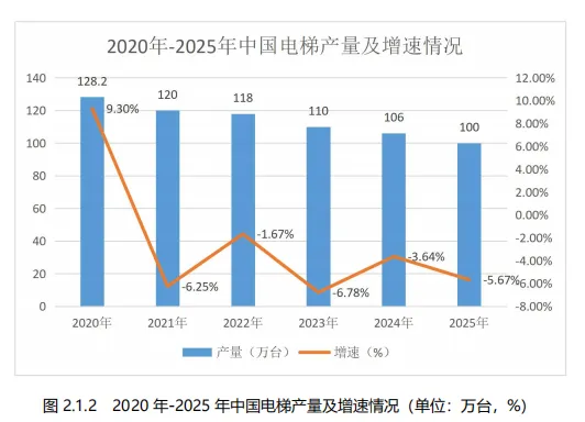 2025年受房地产市场深度调整影响,新装电梯需求下滑,同比减少12.9%;家用电梯市场逆势实现12.5%的同比增长。在新装电梯市场呈现收缩态势的同时,既有建筑领域的“两旧业务”需求集中释放,同比大幅增长52%;出口业务同样表现强劲,同比增长超过20%。多重积极因素叠加,推动电梯全年总发运量维持在100万台左右。