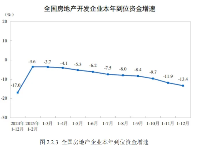 2025年,房地产开发企业到位资金93117亿元,比上年下降13.4%。其中,国内贷款14094亿元,下降7.3%;利用外资25亿元,下降20.8%;自筹资金33149亿元,下降12.2%;定金及预收款28089亿元,下降16.2%;个人按揭贷款12852亿元,下降17.8%。
