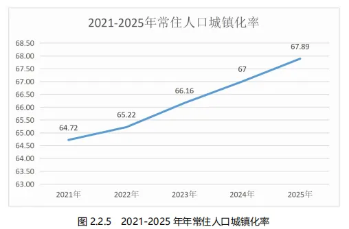 据国家统计局数据,2025 年末全国常住人口城镇化率67.89%,较 2024 年提升0.89 个百分点;城镇常住人口95380 万人,乡村常住人口45109 万人。