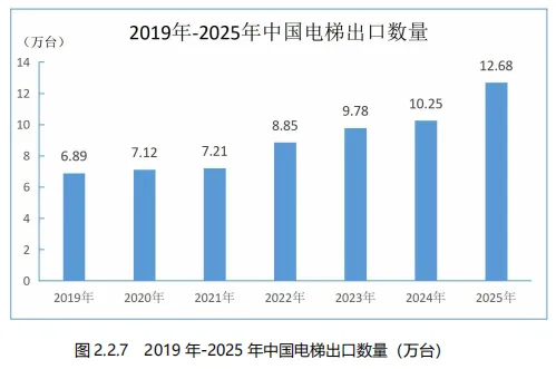 中国是全世界最大的电梯生产国,也是全世界最大的电梯出口国,2019年-2025年,我国电梯出口量不断上升。