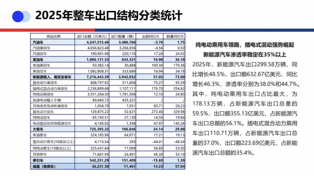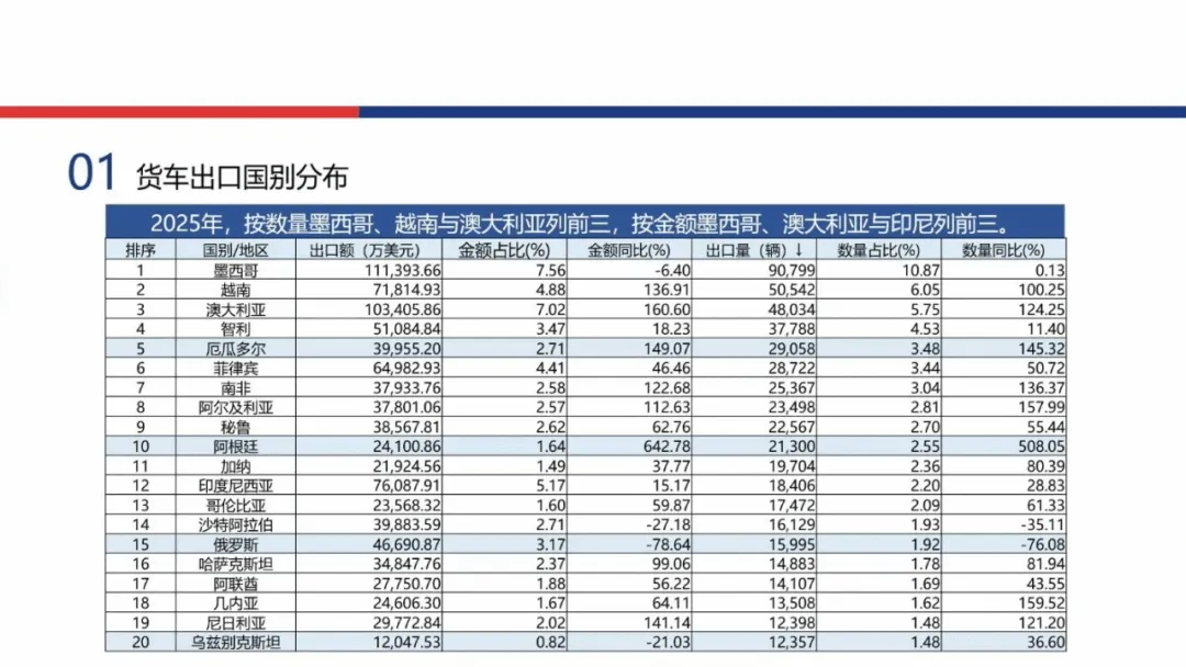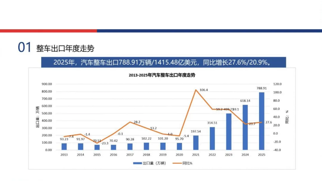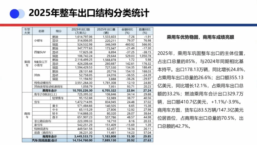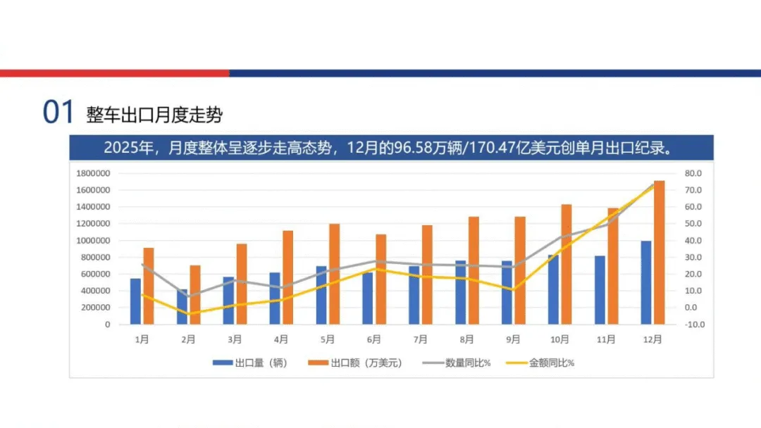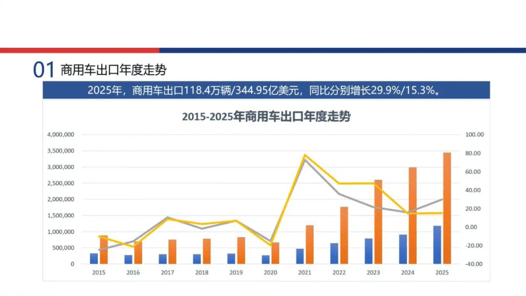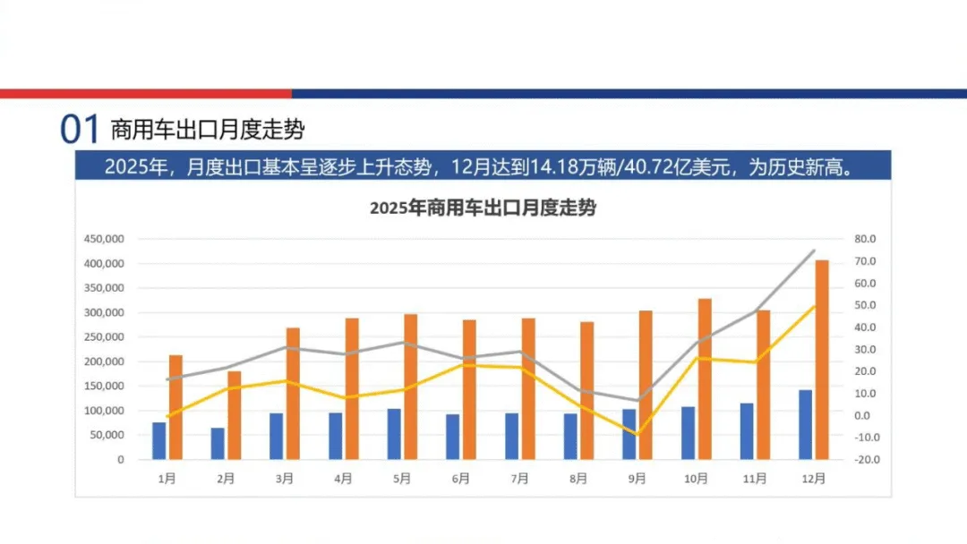 2025年中国汽车出口延续强劲增长态势,整车出口量达788.91万辆、出口额1415.48亿美元,同比分别增长27.6%、20.9%,其中商用车出口表现亮眼,全年出口118.4万辆、344.95亿美元,同比增长29.9%、15.3%,月度出口量于12月创下历史新高,整体呈现稳步攀升走势。