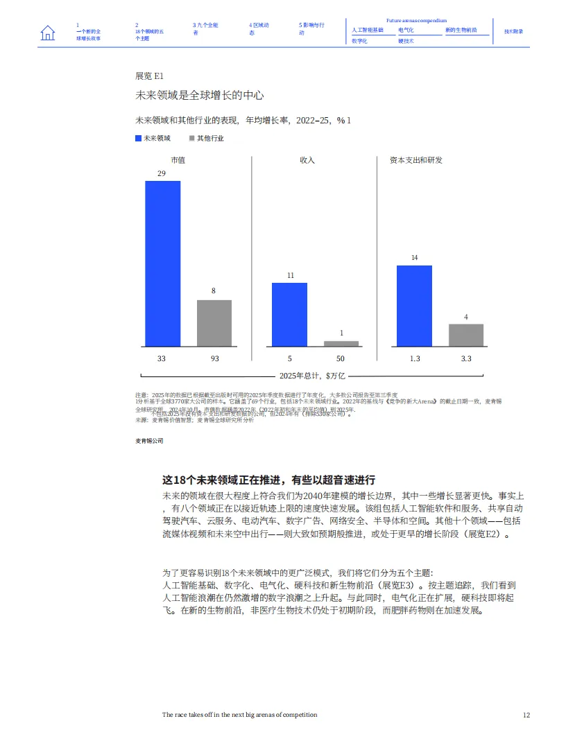 报告将18个未来领域划分为人工智能基础、数字化、电气化、硬科技、新生物前沿五大主题,这些领域增长远超传统行业,2022-2025年市值年均增速29%、收入年均增速11%,贡献了全球近半的市值与收入增长,预计2040年营收规模可达29-48万亿美元。其中人工智能基础板块增长最为突出,三年间市值增加11万亿美元,半导体、云服务、AI软件与服务成为价值创造核心。